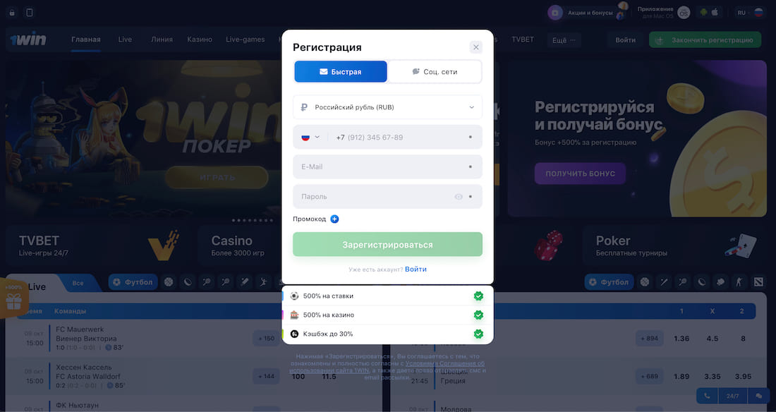 Чтобы делать ставки, играть в казино, участвовать в акциях и смотреть трансляции спортивных событий, необходимо зарегистрироваться на платформе 1вин. Официальный сайт 1 вин предлагает несколько удобных способов создания игрового профиля:
